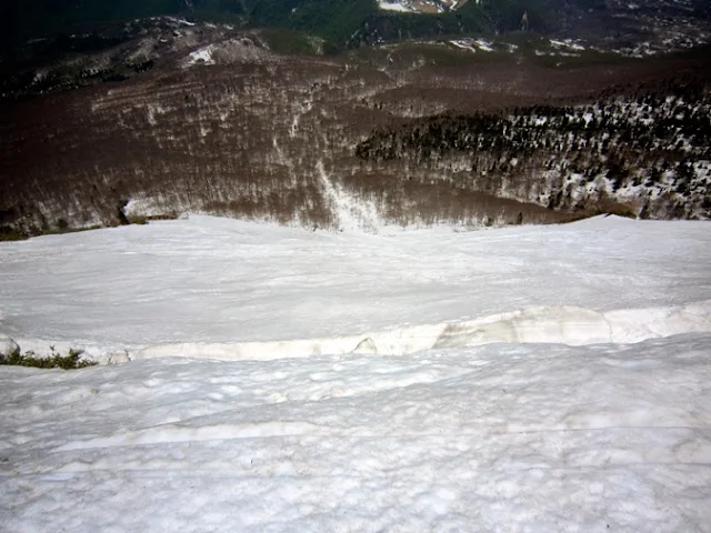 山頂からの滑降は、あっという間。北斜面上部に数カ所、細い断裂ができている。